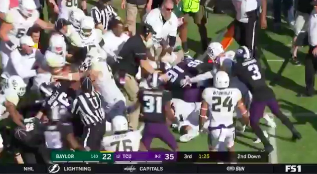 Big fight just broke out between TCU and Baylor. TCU got the penalty for entire bench joining in, although from the looks of it, so did Baylor. pic.twitter.com/AX5IDXPKZD