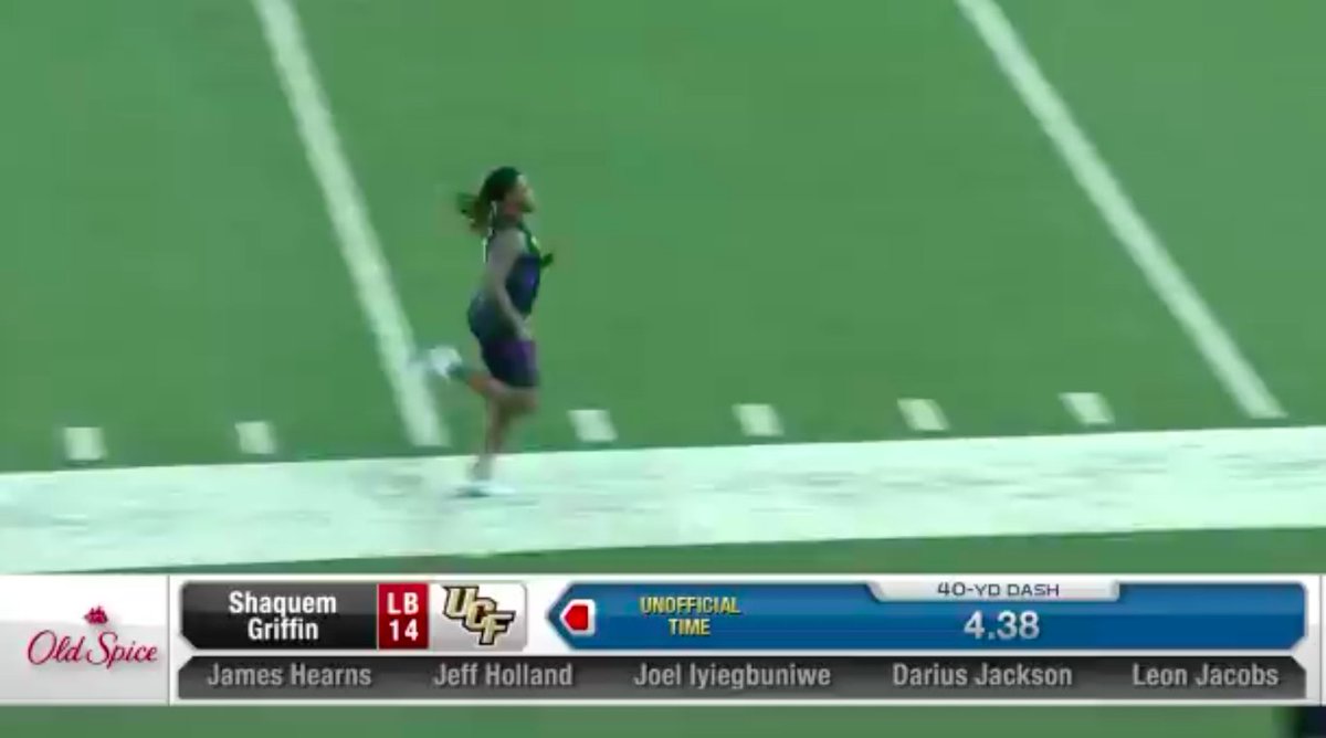 YES! Shaquem Griffin just ran a 4.38 40-yard dash. Fastest 40-yard dash by a LB since 2003. "Happy birthday, Mama," he says on the way out. Wow. Wow. Wow. @nflnetwork @UCF_Football @CFD22 @gmfb @ShaquillG @MoveTheSticks @richeisen @Shaquemgriffin
