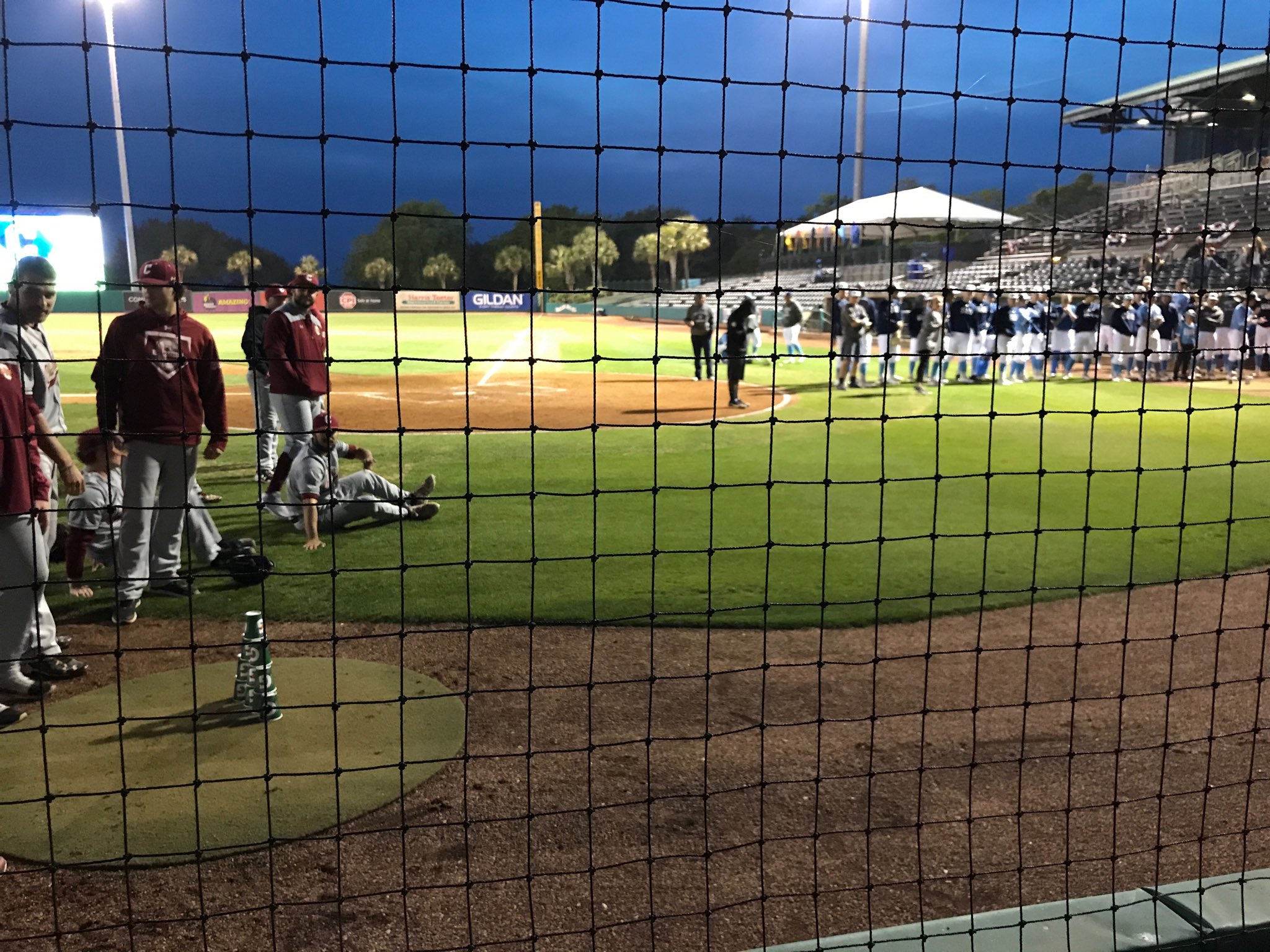 So these two teams went the classic college baseball route and got creative while they had to sit around and wait. We’ve seen all things from dance-offs to human jousting in scenarios like this. College baseball players are the best at coming up with quick games on the spot. They kept it simple and broke out a game of bowling with a baseball and some cups.