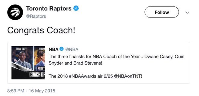 — Toronto Raptors (@Raptors) May 17, 2018