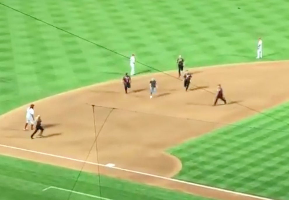 This kid’s Wednesday night stroll wasn’t bad at all. It looks like he came from dead center and as you can see, made it all the way to the infield. Much further than most of these guys get. He was all about distance. Just a dead sprint from the get-go with no moves in his repertoire except that little stutter step hesi which shook all three security guards closing in. Good effort all around.