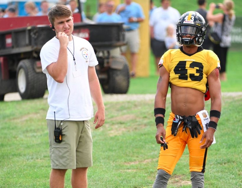 Post-Gazette – A Steelers fan dressed in yellow football pants, a yellow jersey and a helmet made it past security Saturday afternoon and attempted to take part in some drills at the beginning of Steelers practice.