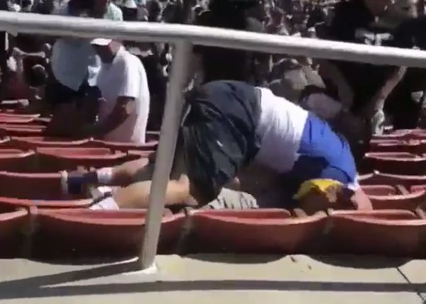 Of course there was a fan fight Saturday at the Coliseum when Raiders fans invaded their old stomping grounds primed to stop some heads. By now you know that the Coliseum is a Thunderdome for NFL fans. Some enter, some never leave or leave in handcuffs. We’ve posted dozens of videos of people brawling in that place.