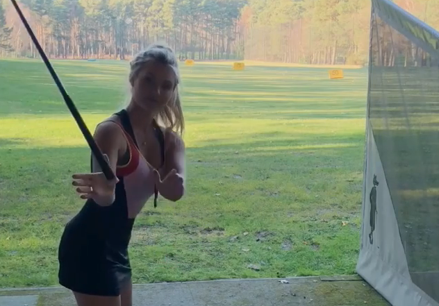 It’s been hot AF over in England this week from what I hear out of the English media and that means IG rising star golfer Lucy Robson is able to get out and about to create some outdoors trick shots after being holed up this winter doing her thing for Valentine’s Day when she popped a bottle with a wedge and then played beer pong with her wedge.