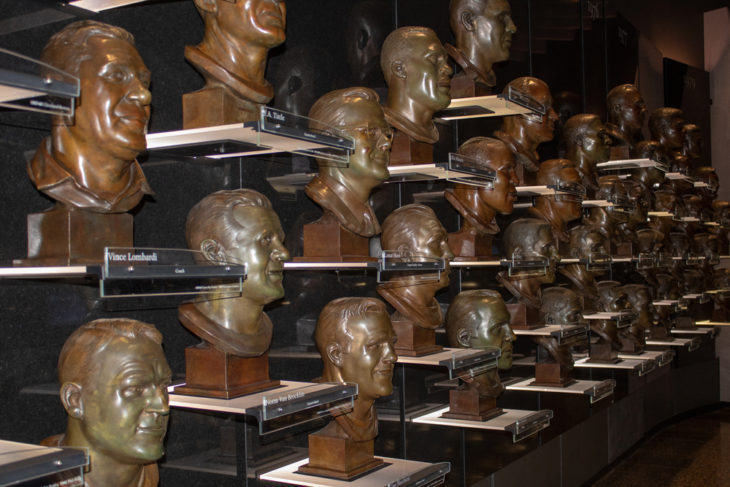Canton, Oh / USA - April 17, 2019: View of wall with Pro Football Hall of Fame inductees bronze busts.